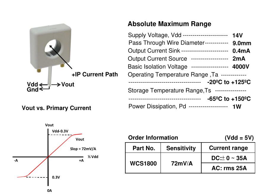 - Output: Ratiometric analog voltage, ~2.5 V at zero current, with sensitivity β 72 mV/A